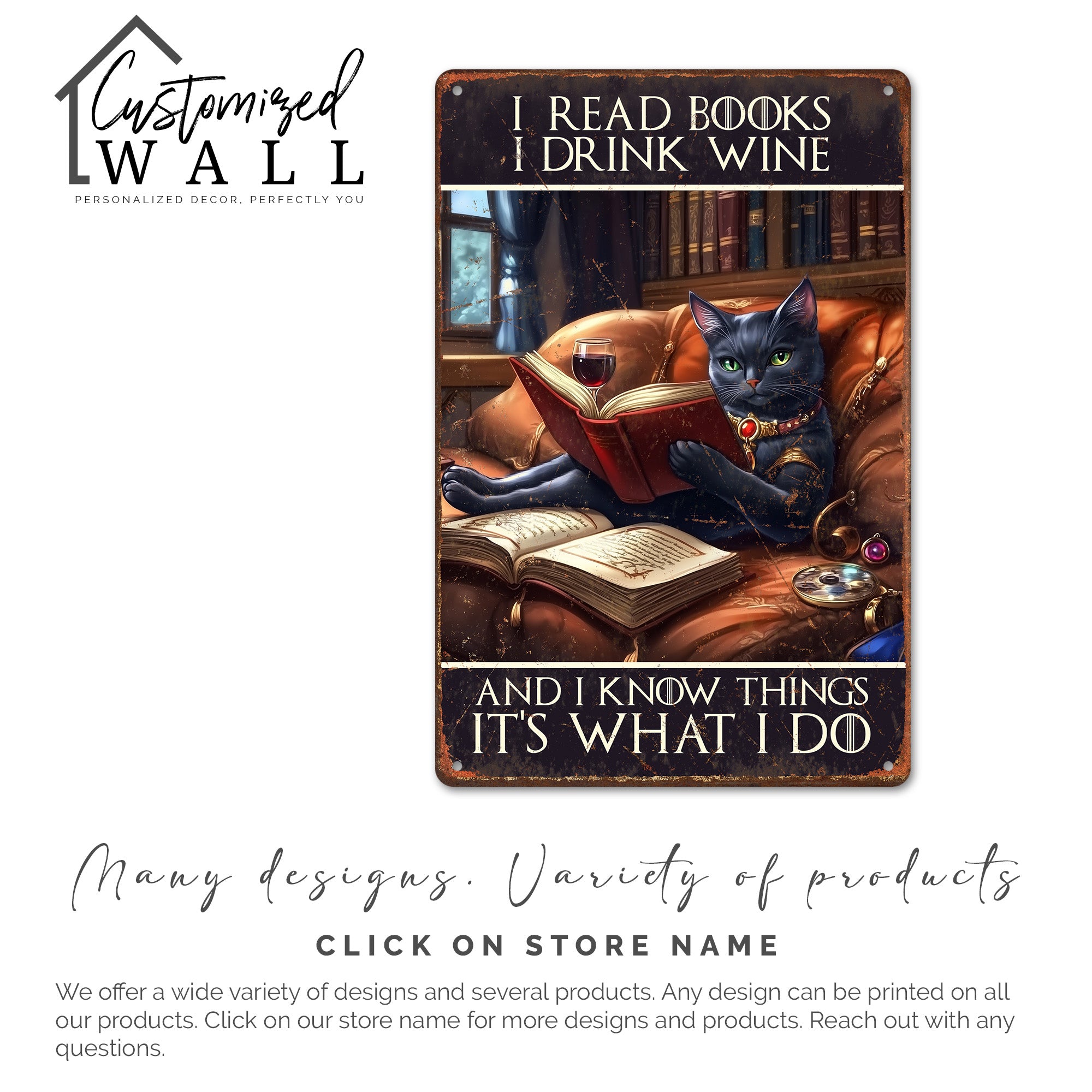 TAGS: cat lover gift, personalized metal sign, book lover decor, wine enthusiast present, vintage home decor, custom wall art, cat wine art, reading gift, unique housewarming, quirky sign, mom gift, sister gift, handmade sign, decorative metal sign, personalized home decoration