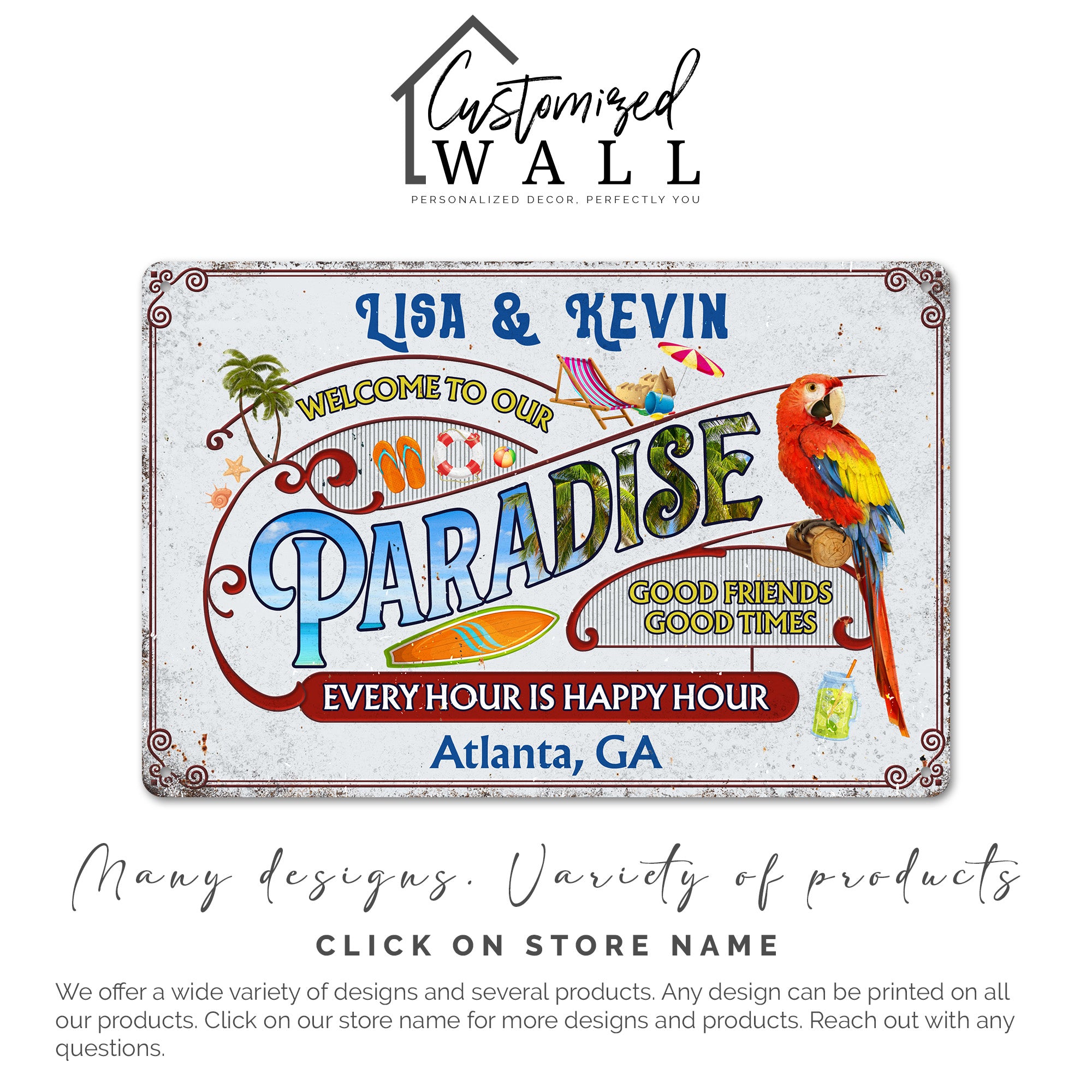 TAGS: personalized sign, tropical decor, metal sign, custom metal sign, paradise sign, gift for mom, gift for dad, gift for couple, home bar decor, outdoor decor, handcrafted sign, Atlanta GA decor, customizable gift, personalized wall art, tropical gift ideas