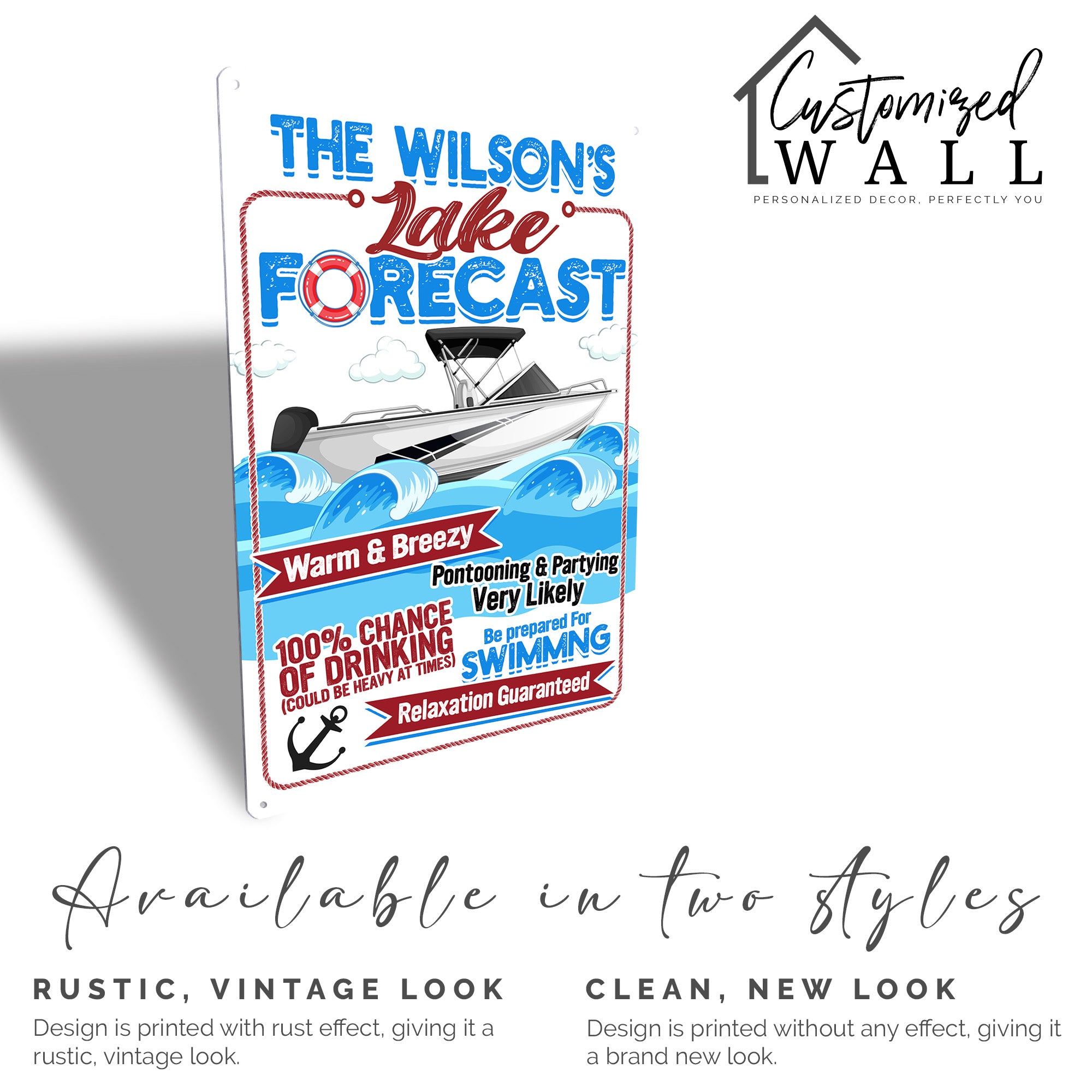Embrace the lake life with our Personalized Lake Forecast Metal Sign, crafted to add a touch of nautical charm to any home or boat. Featuring vibrant colors and playful graphics, this metal sign showcases a stylish boat riding the waves with a forecast of “Warm & Breezy” and “100% Chance of Drinking.” Whether for your own retreat or as a thoughtful gift, this sign perfectly captures the spirit of relaxation and fun.