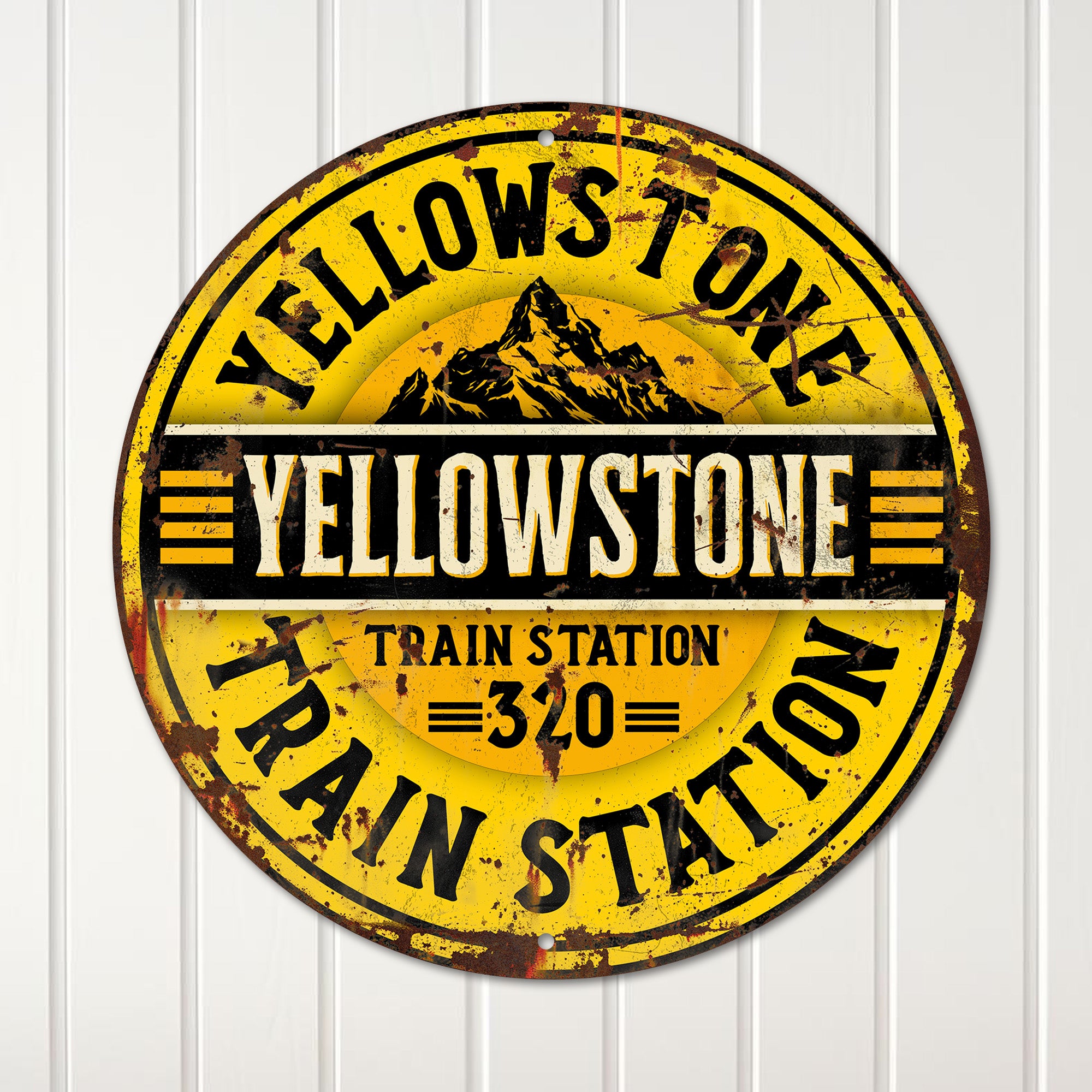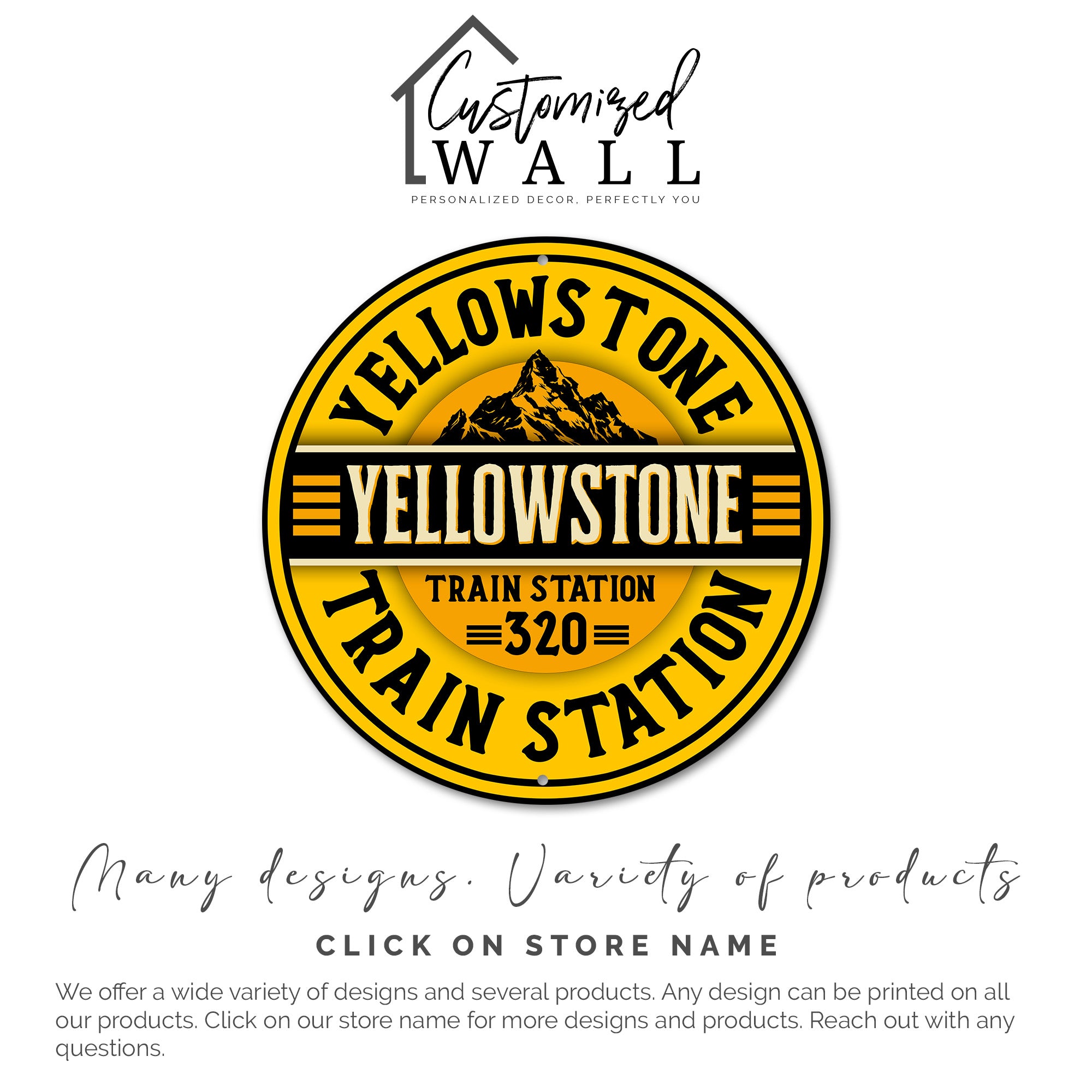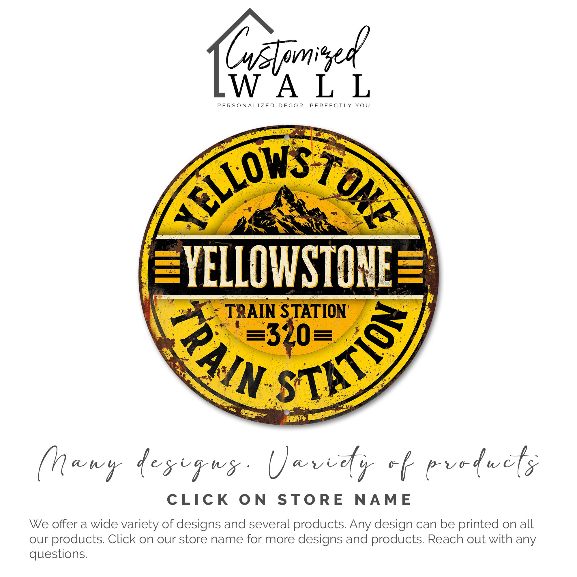 TAGS: personalized metal sign, Yellowstone home decor, rustic mountain design, custom train station sign, gift for travelers, adventure decor, nature-inspired art, housewarming gift, birthday present, anniversary gift, round metal sign, handmade gifts, outdoor lovers, family keepsake, creative wall art