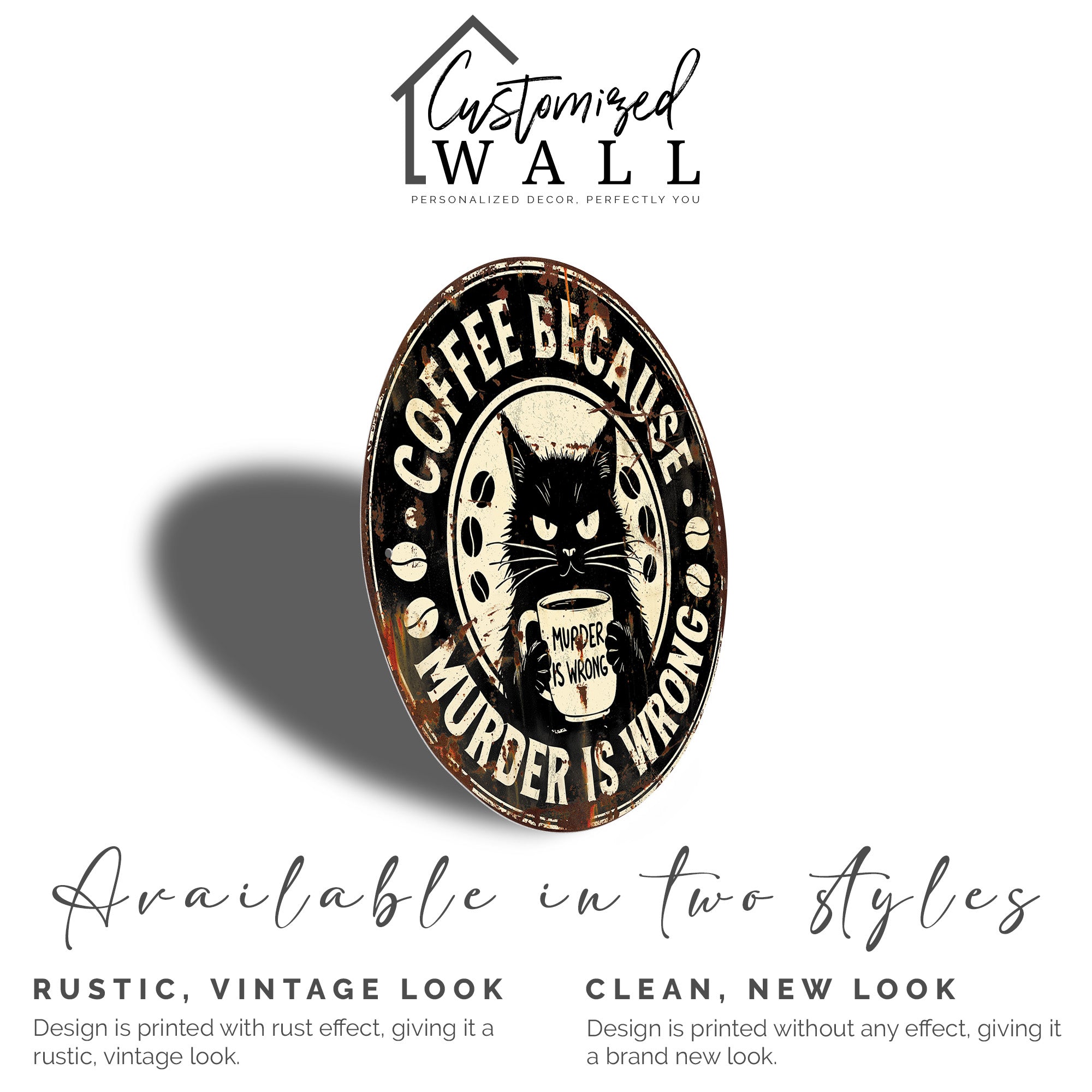 Unleash laughter and charm with our Quirky Cat Coffee Metal Sign. This round sign cleverly reads, "Coffee Because Murder Is Wrong," featuring a grumpy black cat holding a humorous coffee mug. Crafted from premium-quality metal, the durable design ensures long-lasting appeal, making it an ideal addition to any kitchen, office, or coffee nook.