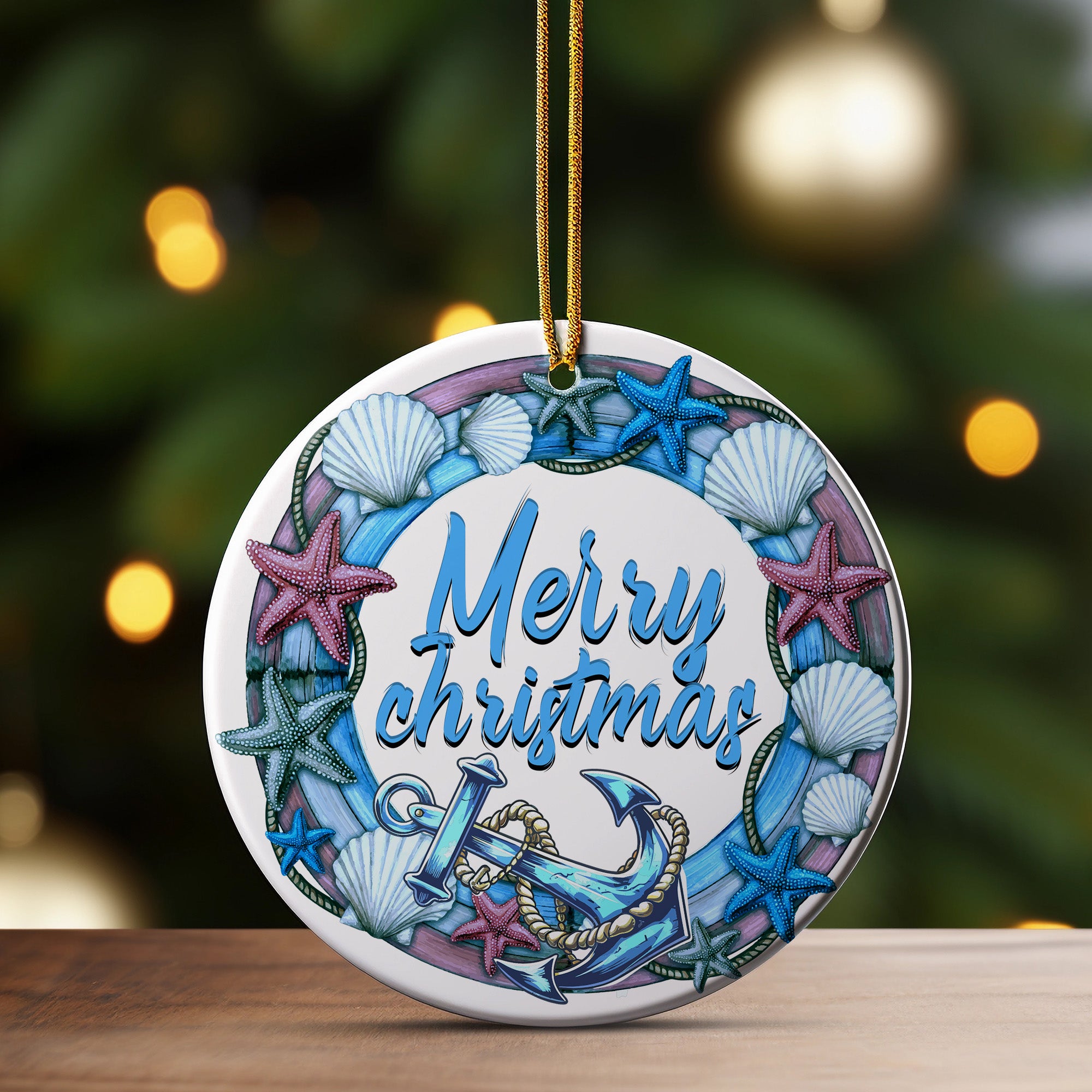 Celebrate the holiday season with our exquisite Personalized Nautical Christmas Ceramic Ornament. This handcrafted gem features a serene coastal design with vibrant hues of blue and pink, intricately detailed with starfish, seashells, and a striking anchor motif. The bold "Merry Christmas" script adds a joyful touch that captures the spirit of the season, blending the tranquility of the sea with festive cheer.