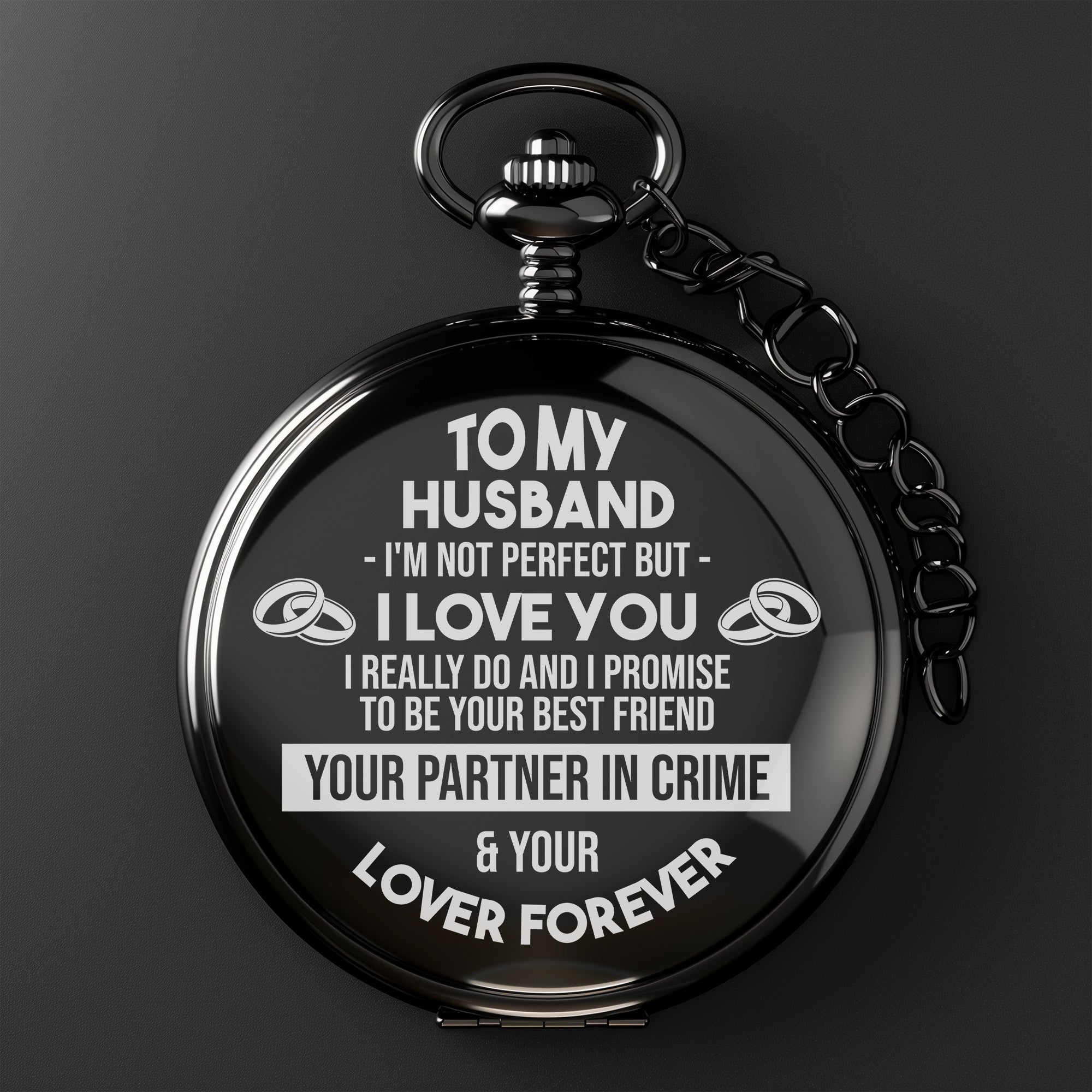 Discover a timeless symbol of love with our personalized pocket watch, perfect for expressing your heartfelt sentiments. Crafted with meticulous attention to detail, this exquisite piece features a sleek black design with elegant white lettering. The pocket watch reads: "TO MY HUSBAND - I'M NOT PERFECT BUT - I LOVE YOU. I REALLY DO AND I PROMISE TO BE YOUR BEST FRIEND, YOUR PARTNER IN CRIME & YOUR LOVER FOREVER," making it a poignant keepsake for your husband.